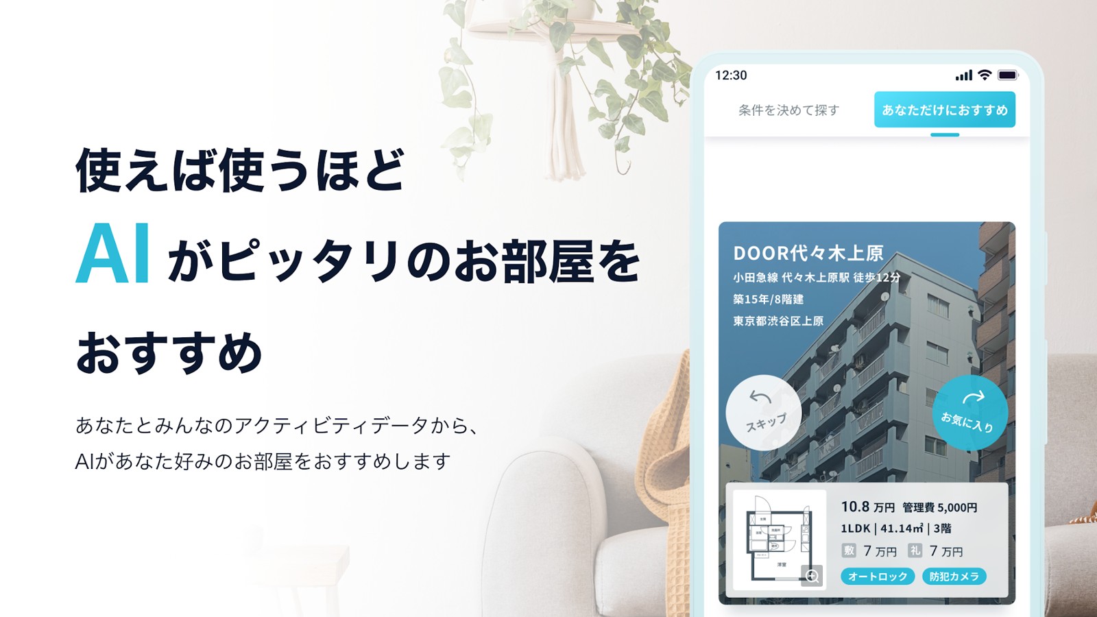 アプリ版DOOR賃貸には、AIが好みを学習してお部屋をレコメンドしてくれる機能が搭載されています。
