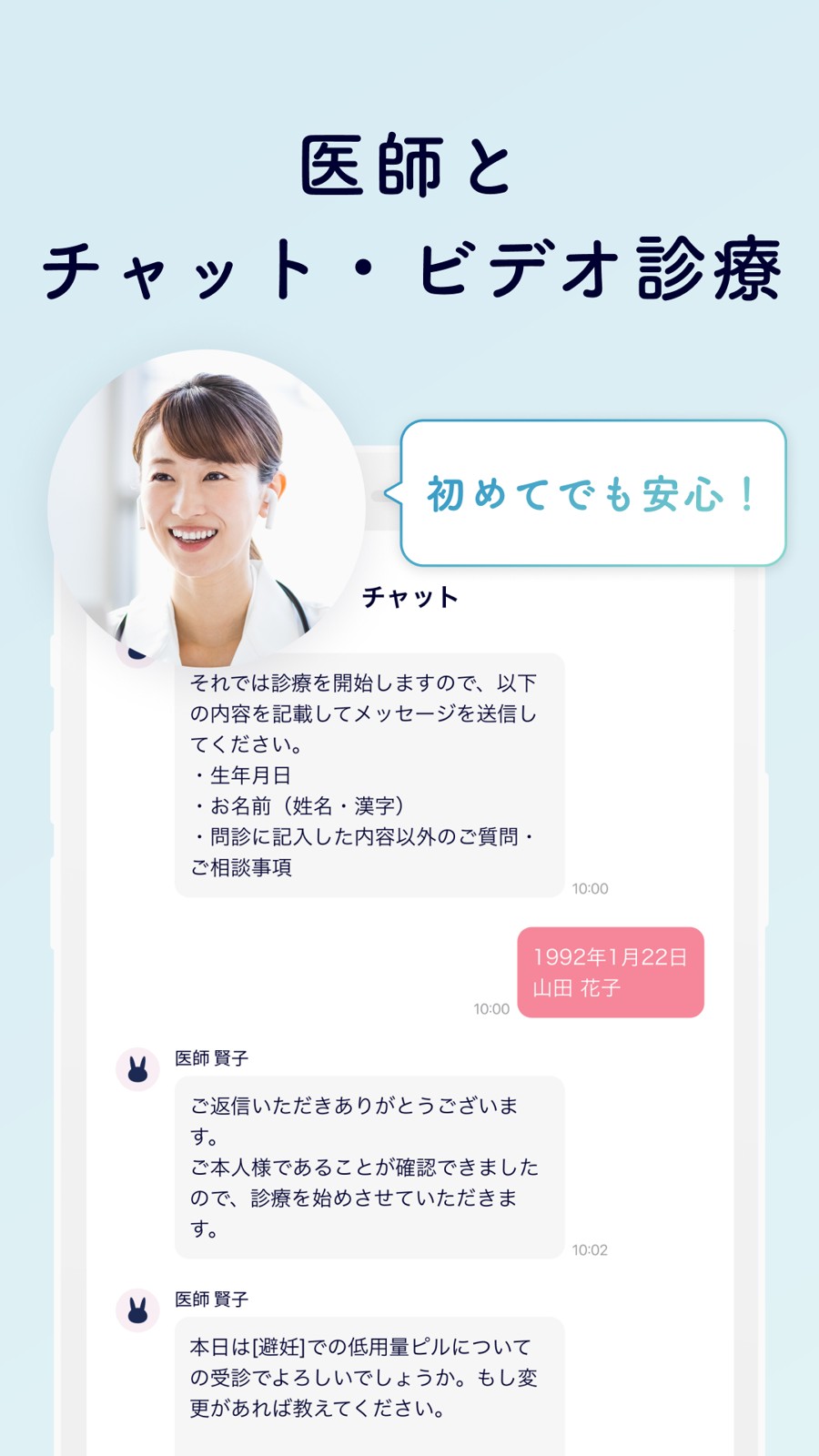 まずチャットで事前のやりとりを行い、その後ビデオ通話で本人確認と診療が進みます。