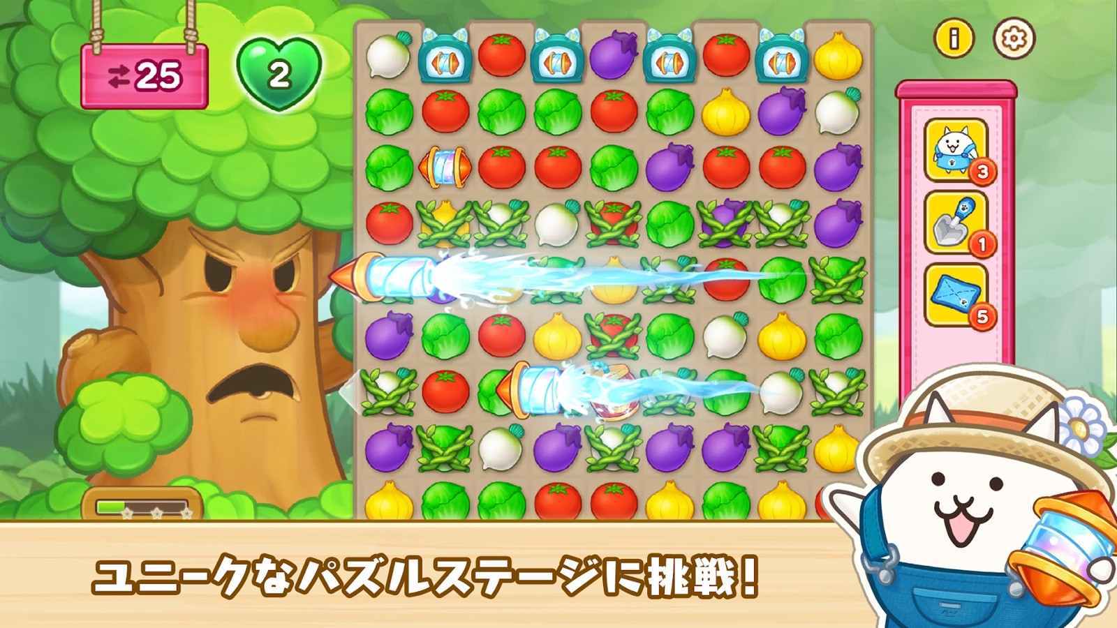 ゲームの基本は、同じ野菜を3つ揃えて消すシンプルなマッチ3パズル