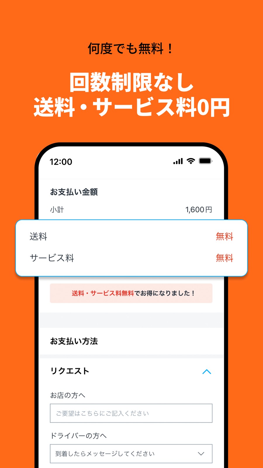 他社デリバリーサービスでは、注文のたびに送料やサービス料がかかりますよね。