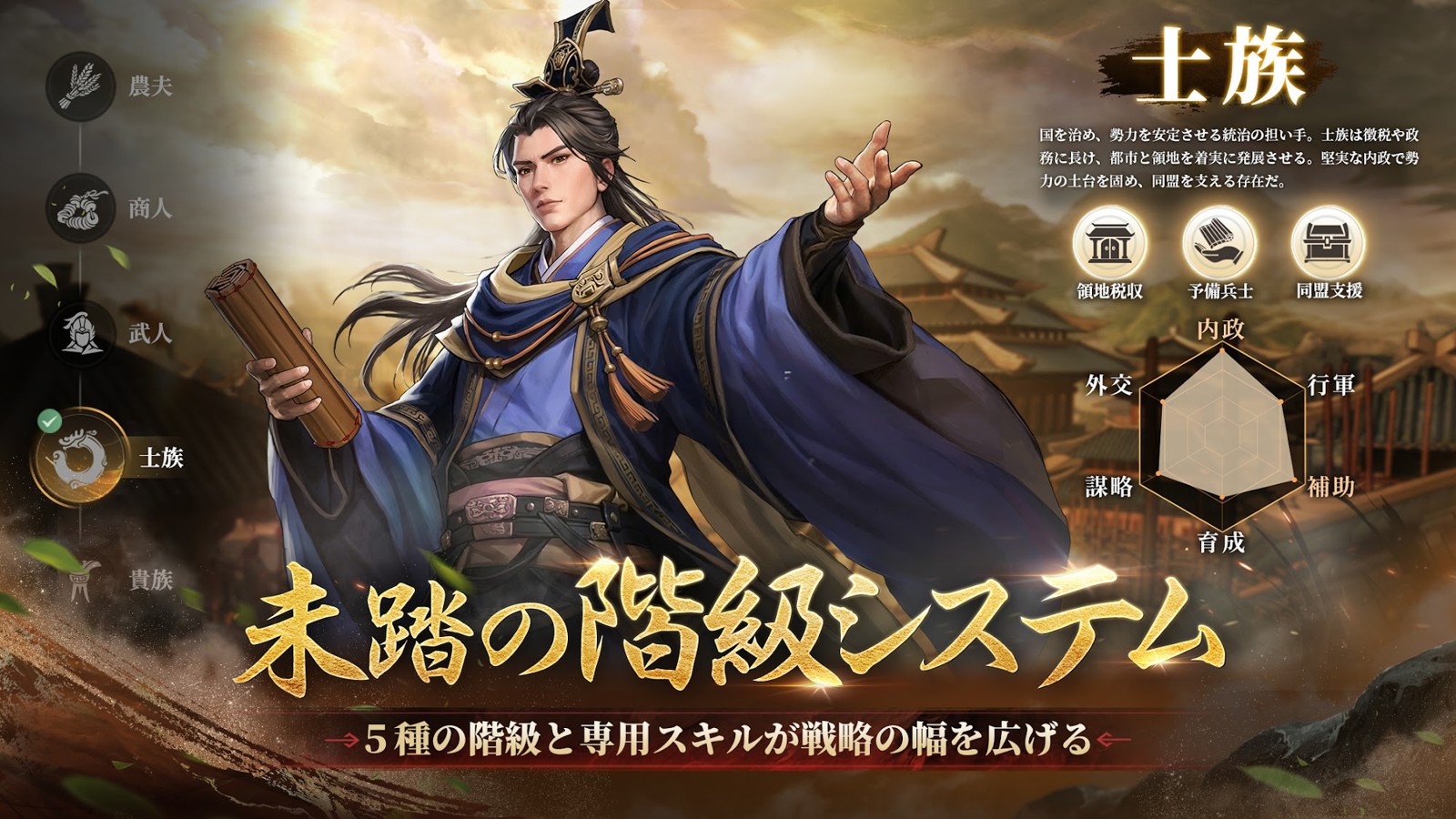 農夫なら拠点育成に強く、武人なら戦闘面で活躍しやすいといった具合に、階級ごとに得意分野が異なります。