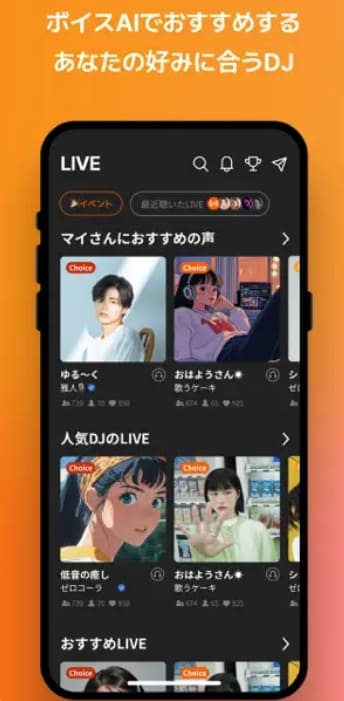アプリを開くといろいろな配信が並んでいて、気になる枠をタップすればすぐ聴ける設計です。